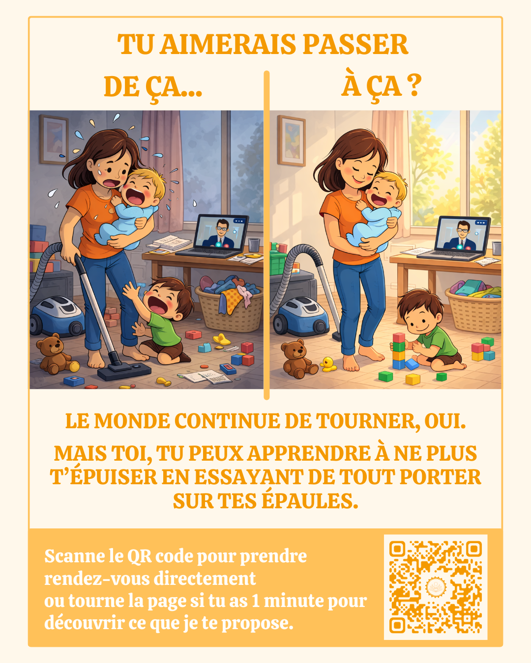 Je culpabilisais... Parce que dans ma tête, une bonne maman était une maman toujours disponible. Et les enfants sentent quand nos mots et notre énergie ne racontent pas la même histoire. J'ai donc travaillé en séance pour changer cette croyance et les séparations se sont apaisées.